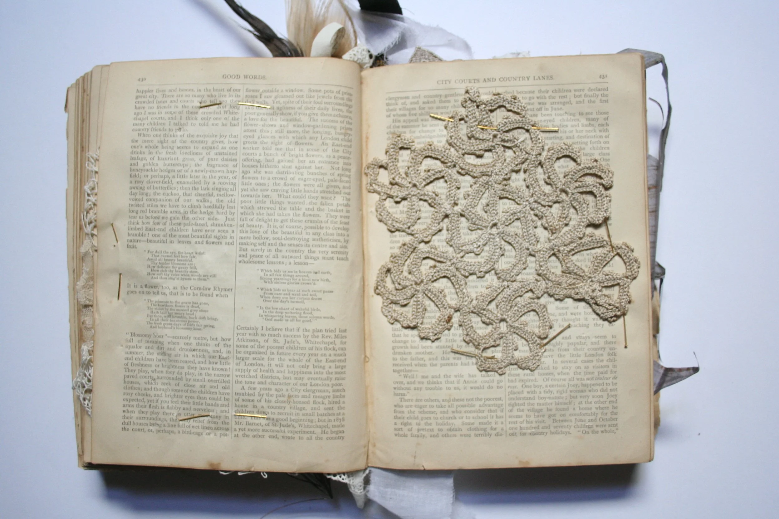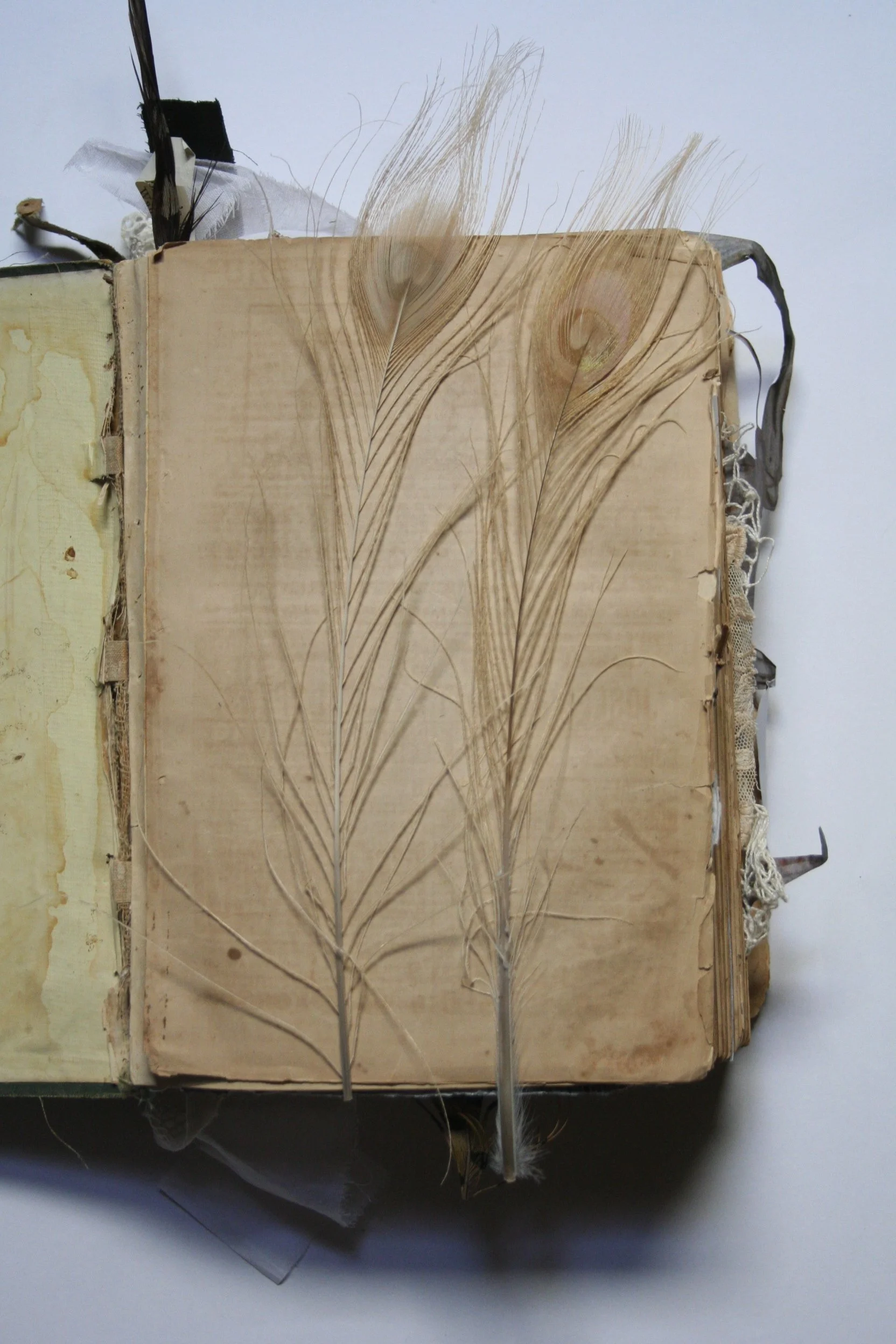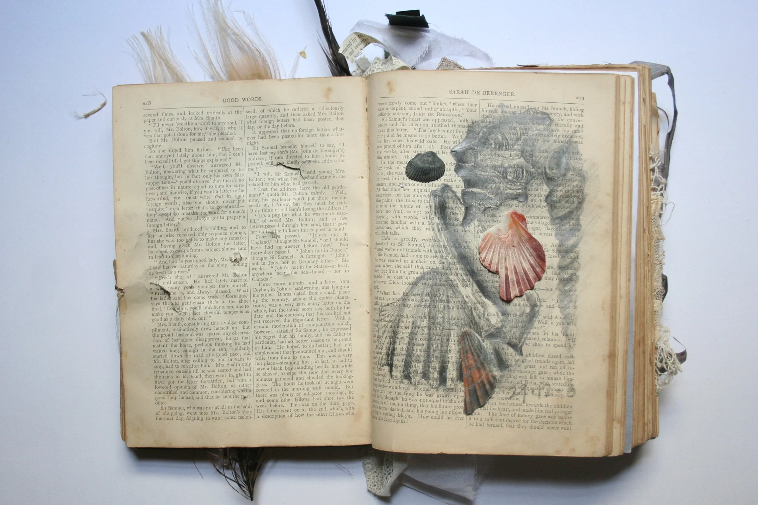 M. Laird, 2009.Pencil, paper, found books, feathers, shell, velvet, lace, metal, thread. Private collection, Melbourne.
