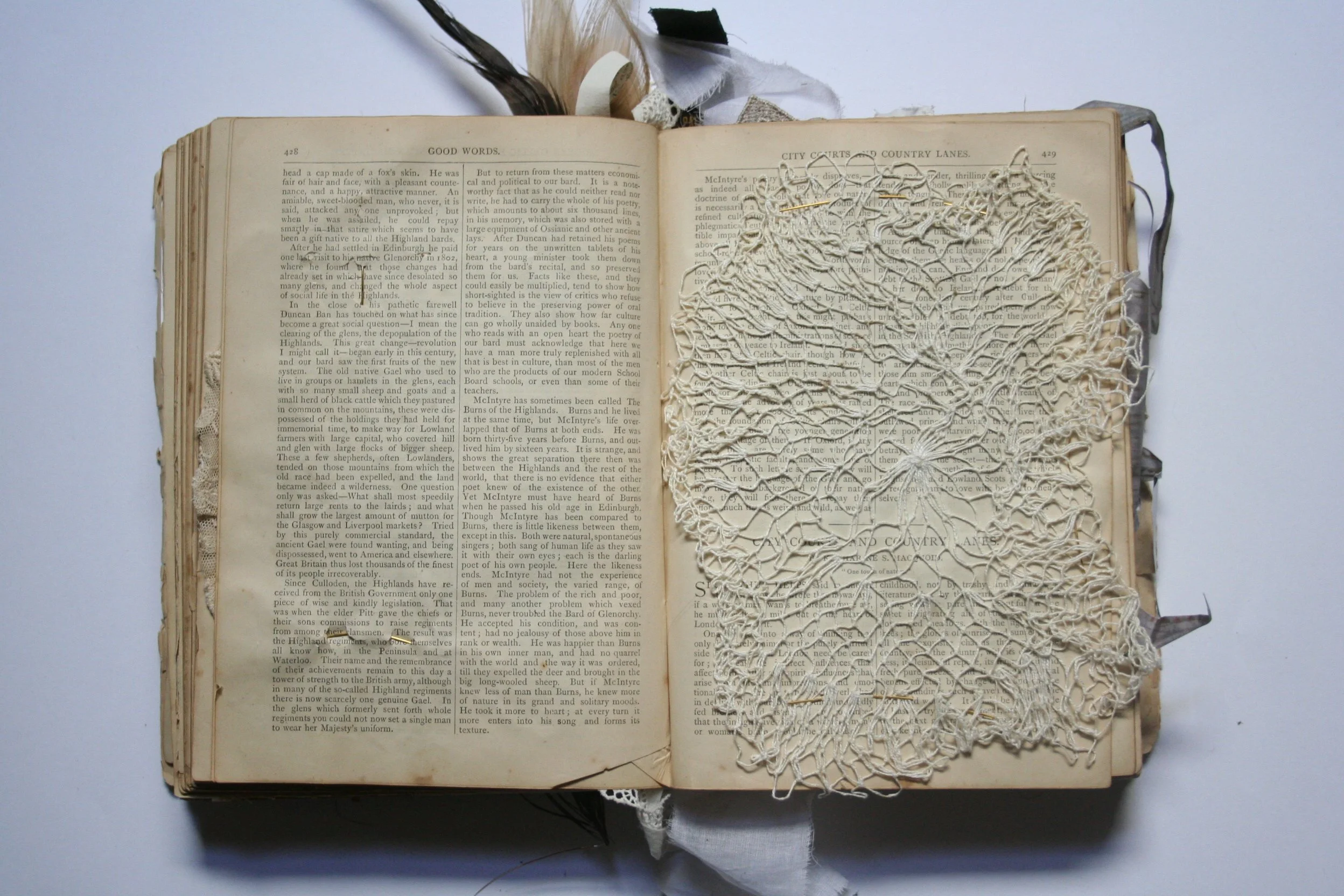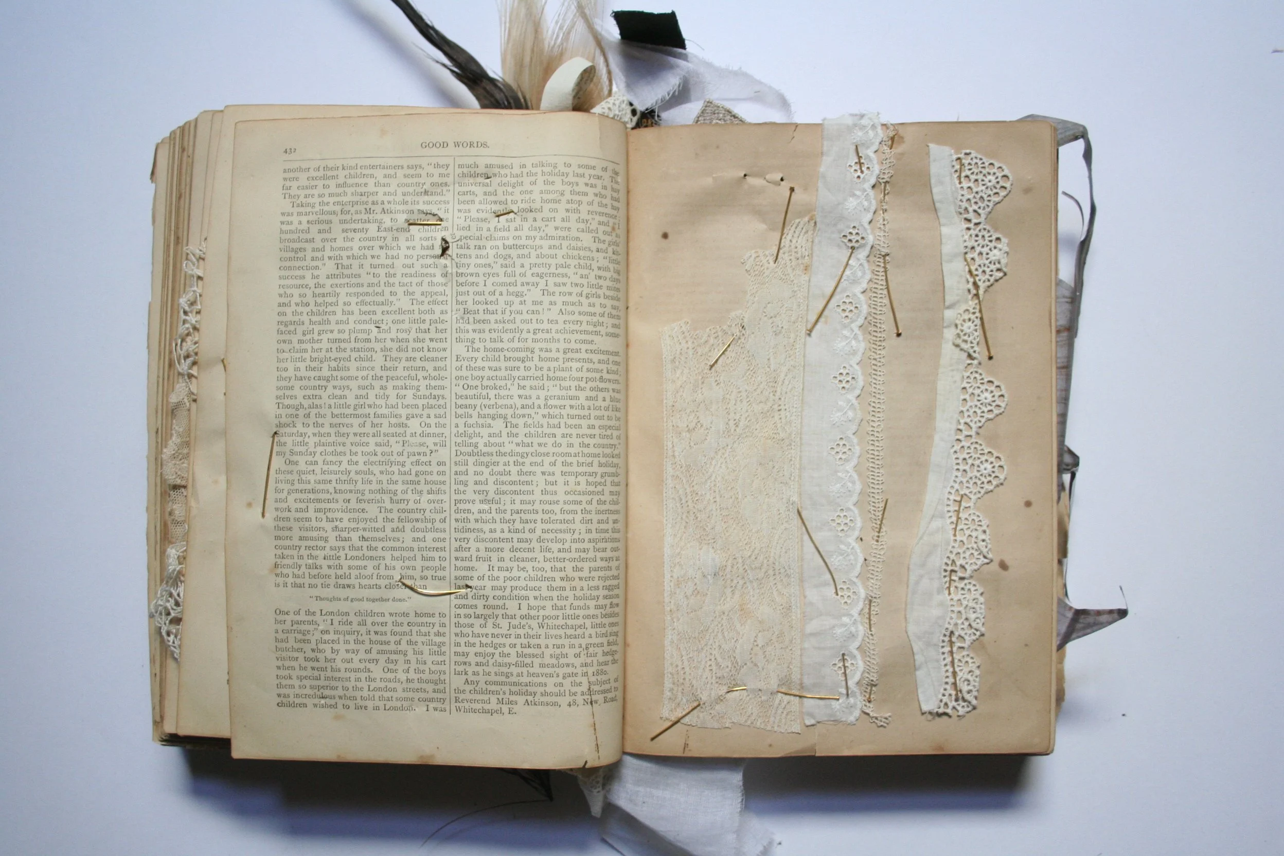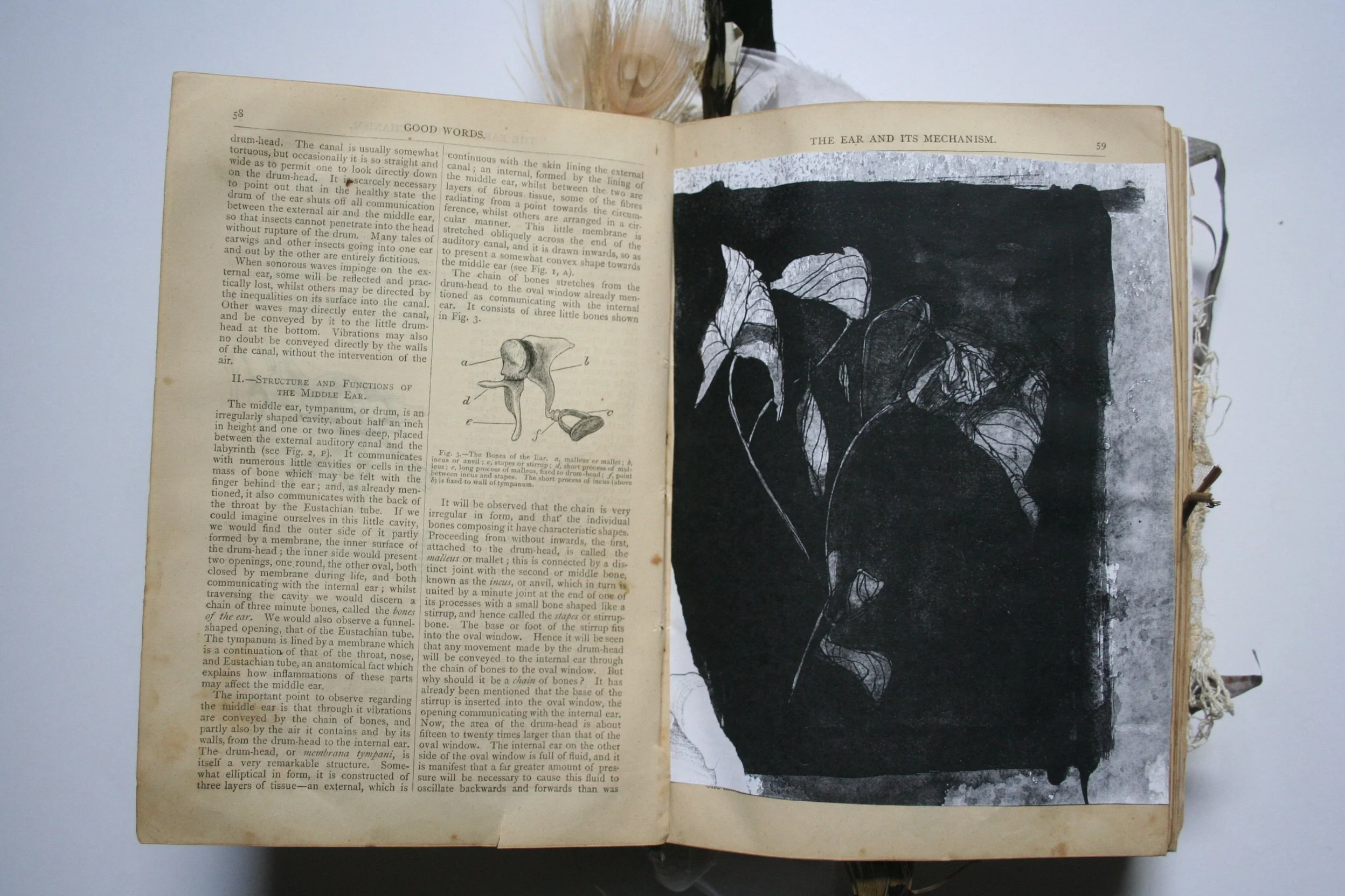 M. Laird, 2009.Pencil, paper, found books, feathers, shell, velvet, lace, metal, thread. Private collection, Melbourne.